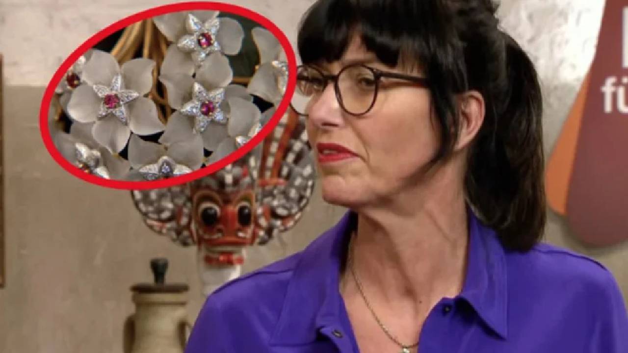 Expertin Heide Rezepa-Zabel (58) nimmt das Objekt anschließend genau unter die Lupe. Sie erklärt: “Wir sehen hier neun Blüten aus Bergkristall, jeweils mit einem Stern aus Weißgold versehen.” Auch Diamanten und ein “künstlicher Rubin” sind vertreten.